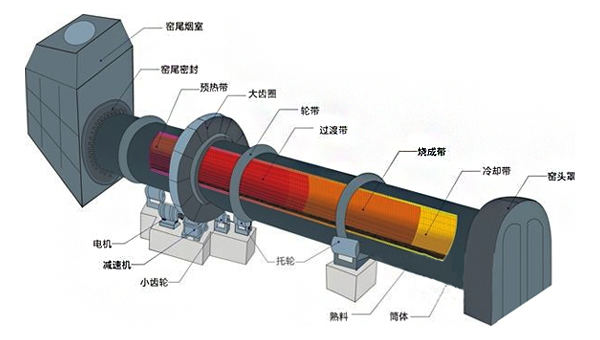 回轉(zhuǎn)窯(旋窯)是一個(gè)有一定斜度的圓筒狀物,斜度為3~3.5%,借助窯的轉(zhuǎn)動(dòng)來促進(jìn)料在回轉(zhuǎn)窯(旋窯)內(nèi)攪拌,使料互相混合、接觸進(jìn)行反應(yīng)。窯頭噴煤燃燒產(chǎn)生大量的熱,熱量以火焰的輻射、熱氣的對流、窯磚(窯皮)傳導(dǎo)等方式傳給物料。物料依靠窯筒體的斜度及窯的轉(zhuǎn)動(dòng)在窯內(nèi)向前運(yùn)動(dòng)。